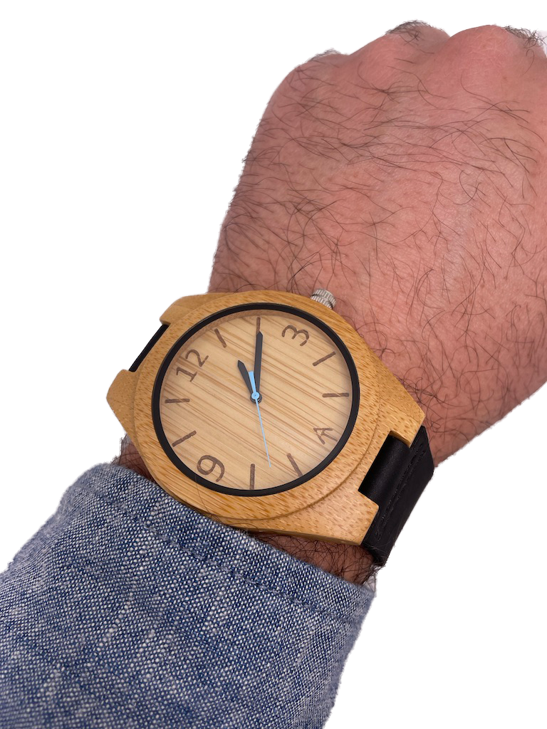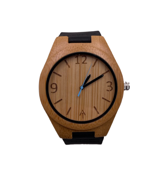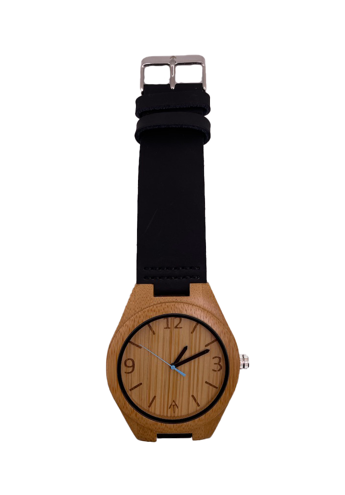 An Ark Timepieces original. This timepiece is classic in appearance. Showcasing a bamboo case and a black leather band. It is lightweight, stylish, and perfect for all instances.