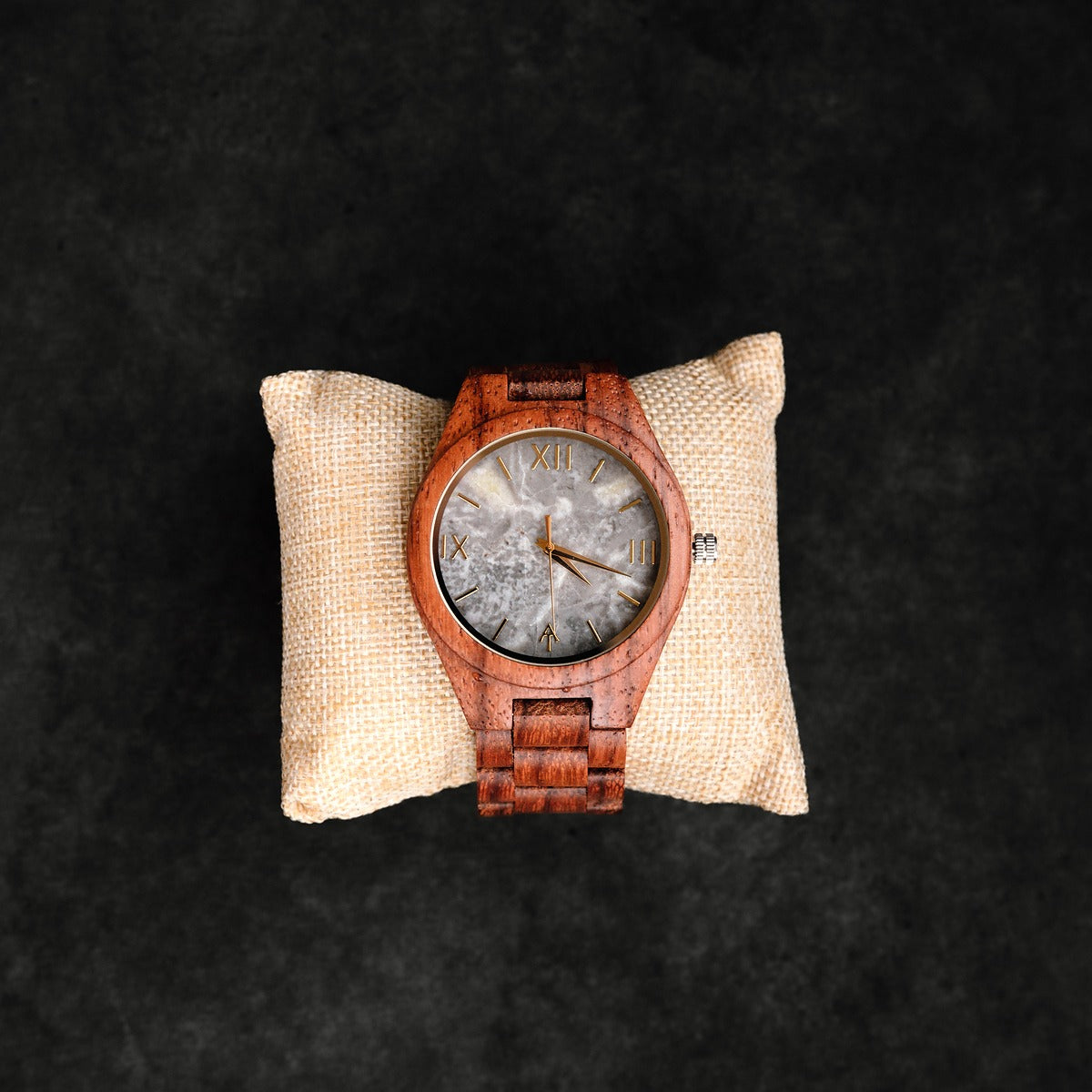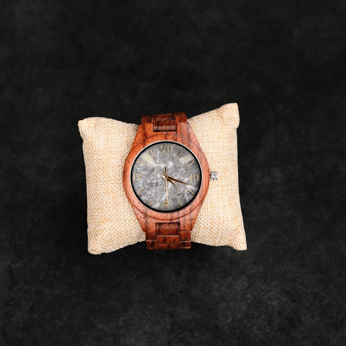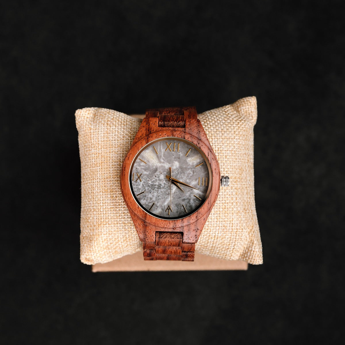 An Ark Timepieces original. With a grey marble face and a mahogany wooden band this watch is sure to stand out. Resemblant of thunder clouds this watch will definitely be a storm people chase.