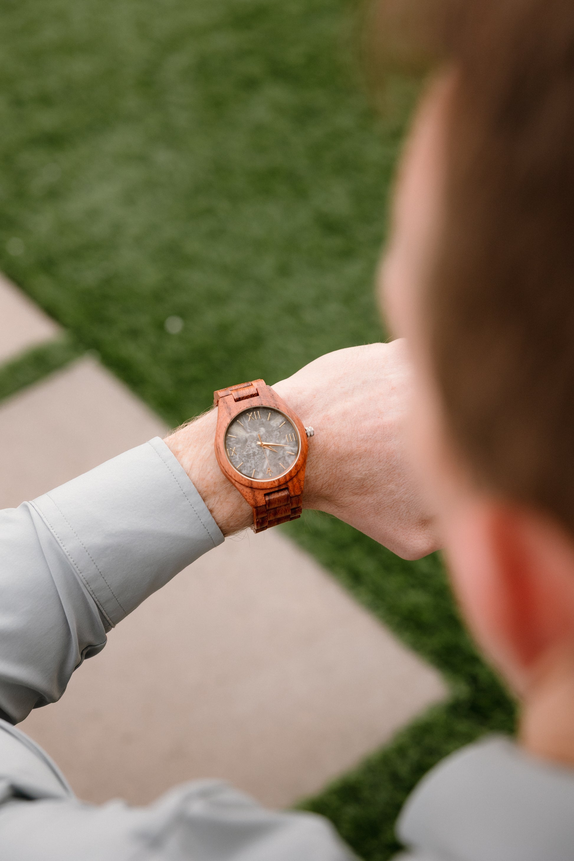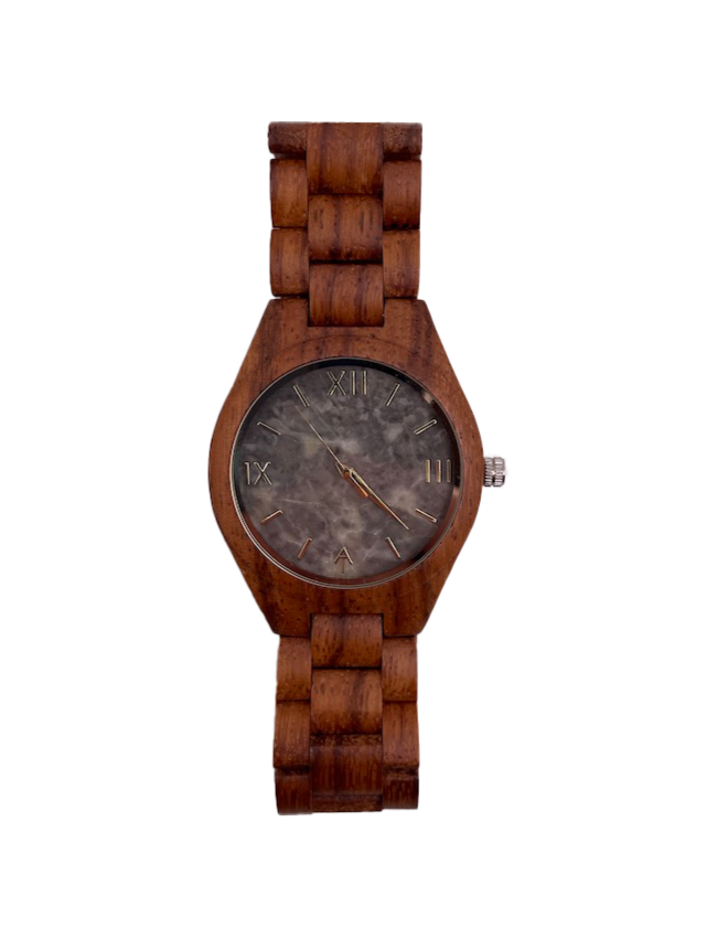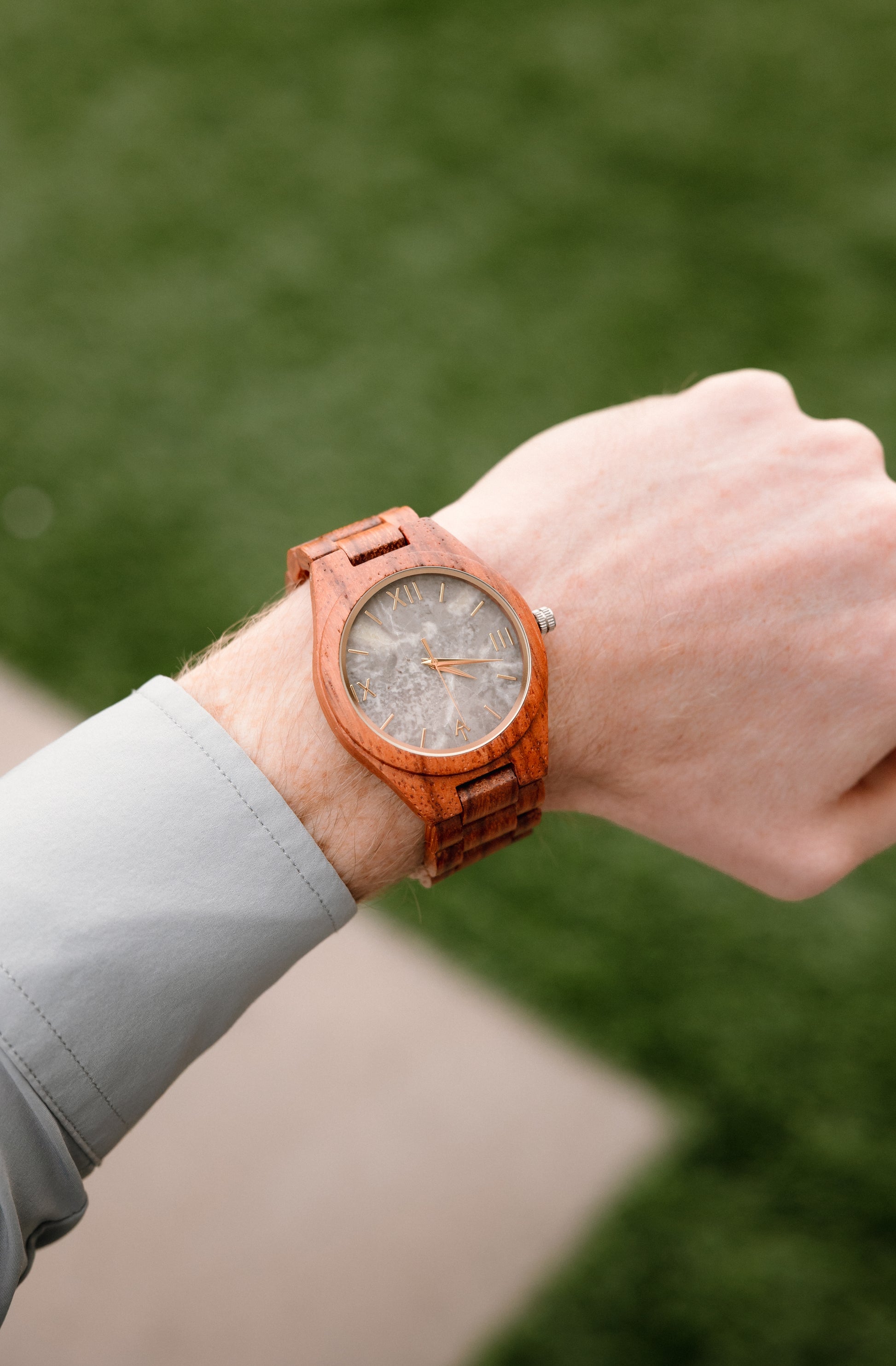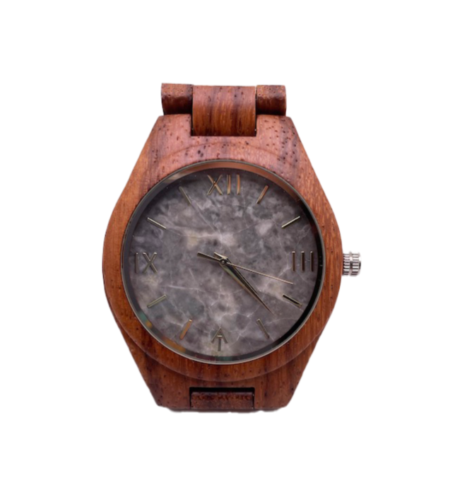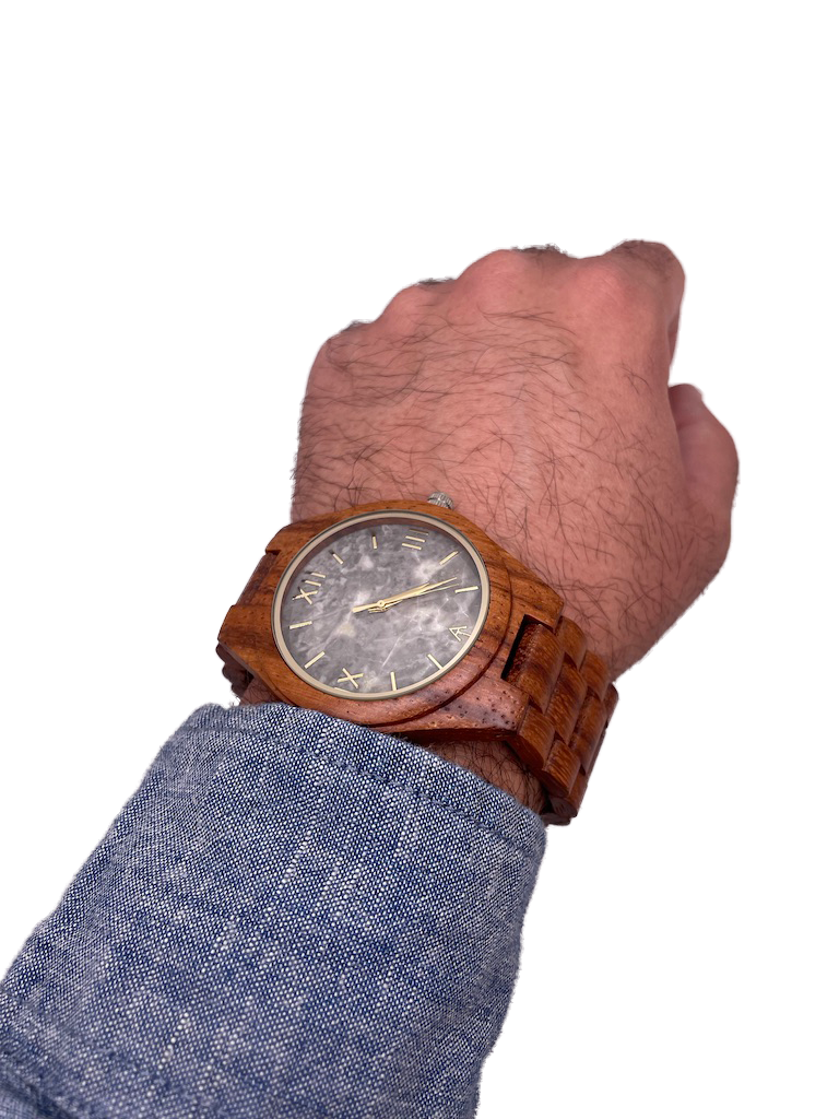 An Ark Timepieces original. With a grey marble face and a mahogany wooden band this watch is sure to stand out. Resemblant of thunder clouds this watch will definitely be a storm people chase.