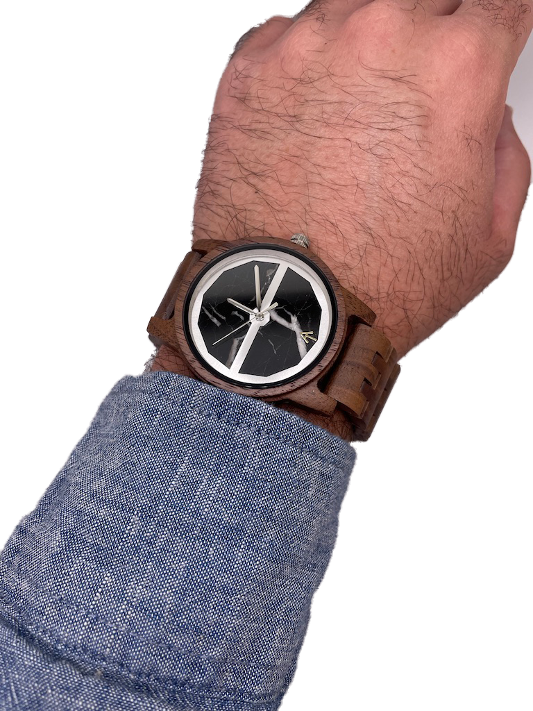 An Ark Timepieces original. With a black marble face and a walnut wooden band this watch is not only sleek but versatile making it the perfect addition to any outfit.