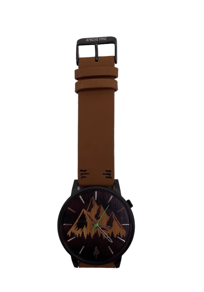 The Midnight Peak is an Apache Pine watch. Made with a stainless steel case and a bamboo dial it is the darker version of Timber. This design is lightweight and comfortable.