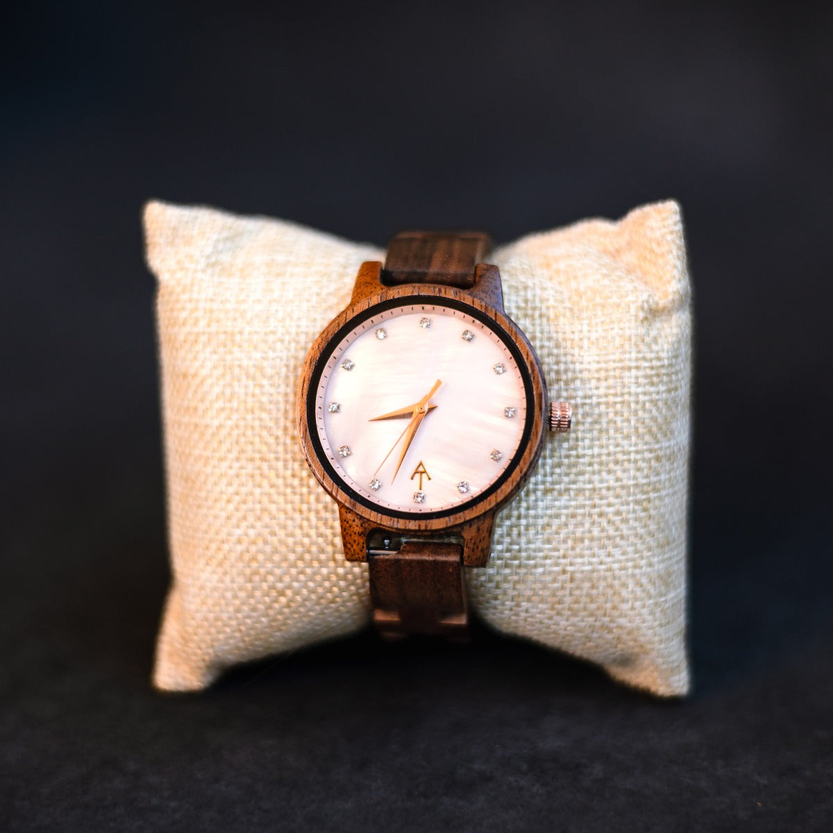 An Ark Timepieces original. With a Pink Sea Shell face and a Walnut wooden band this watch is not only sleek but versatile making it the perfect addition to any outfit.
