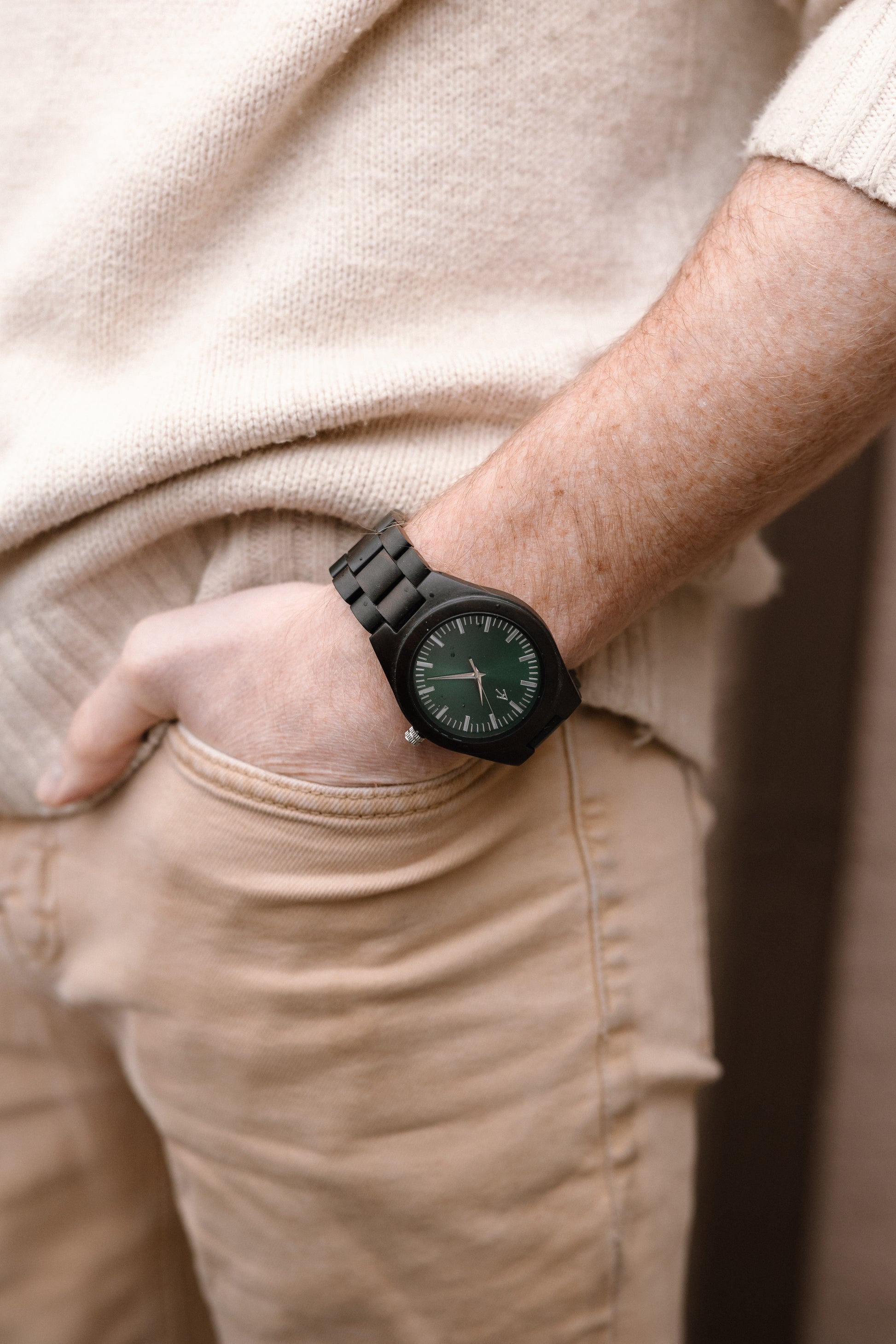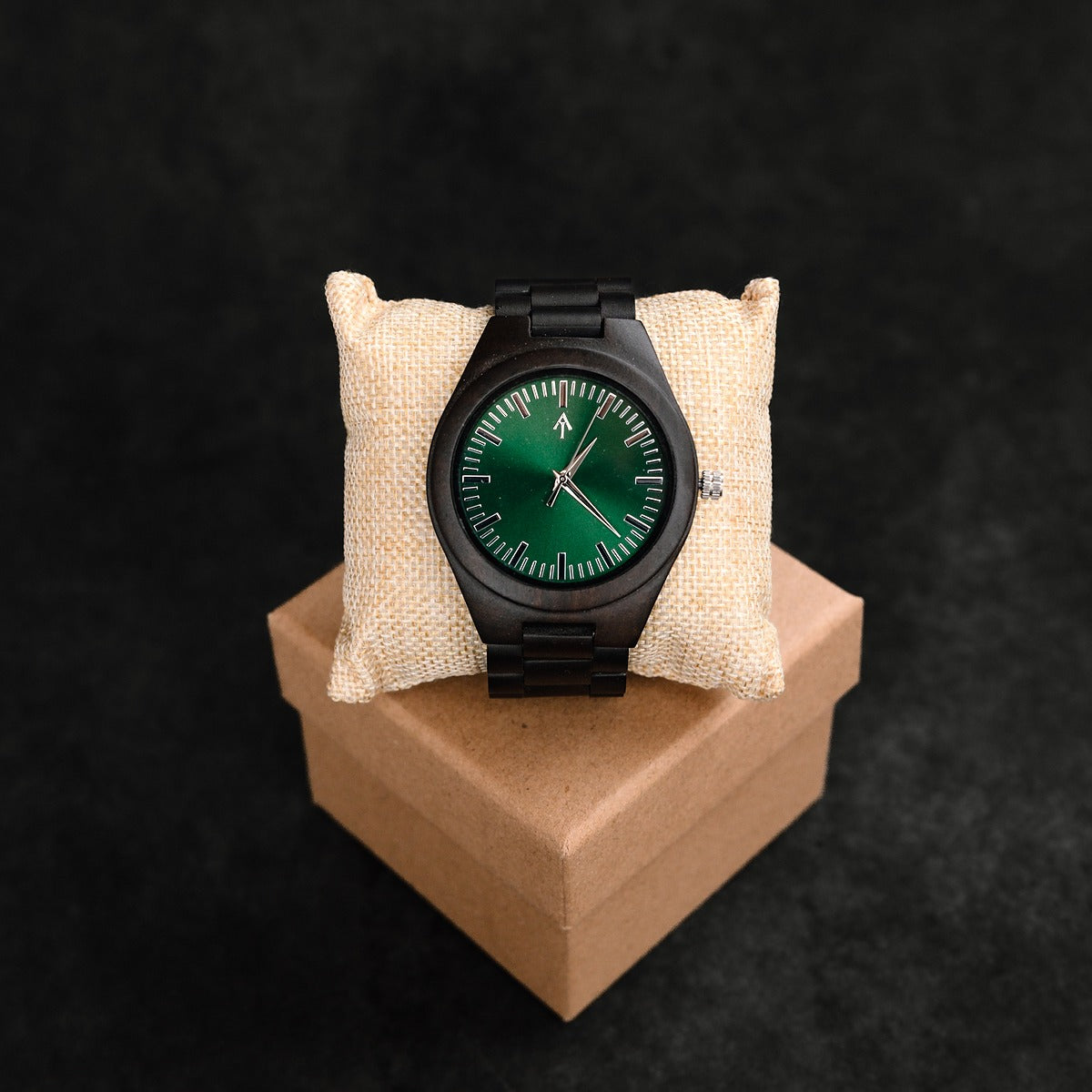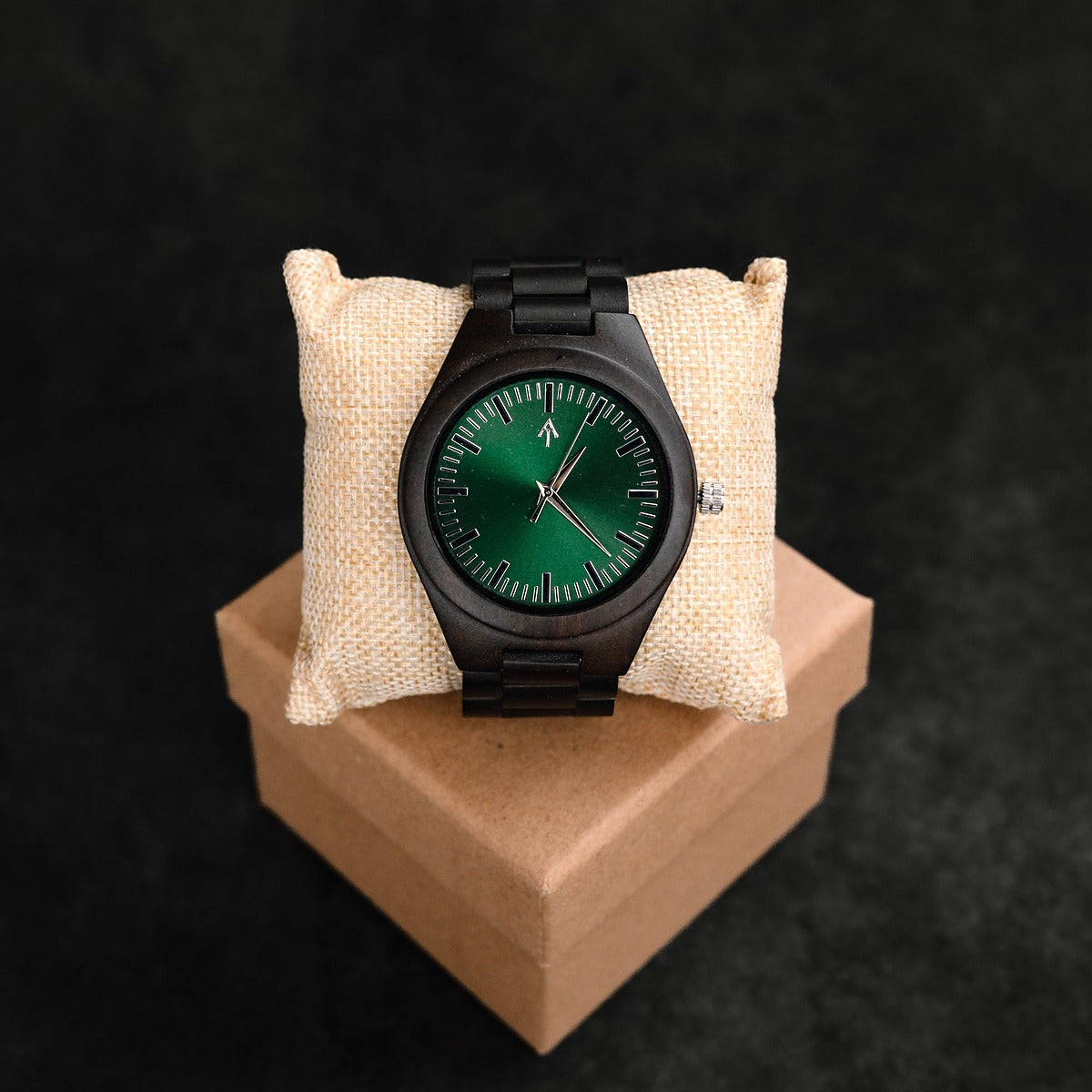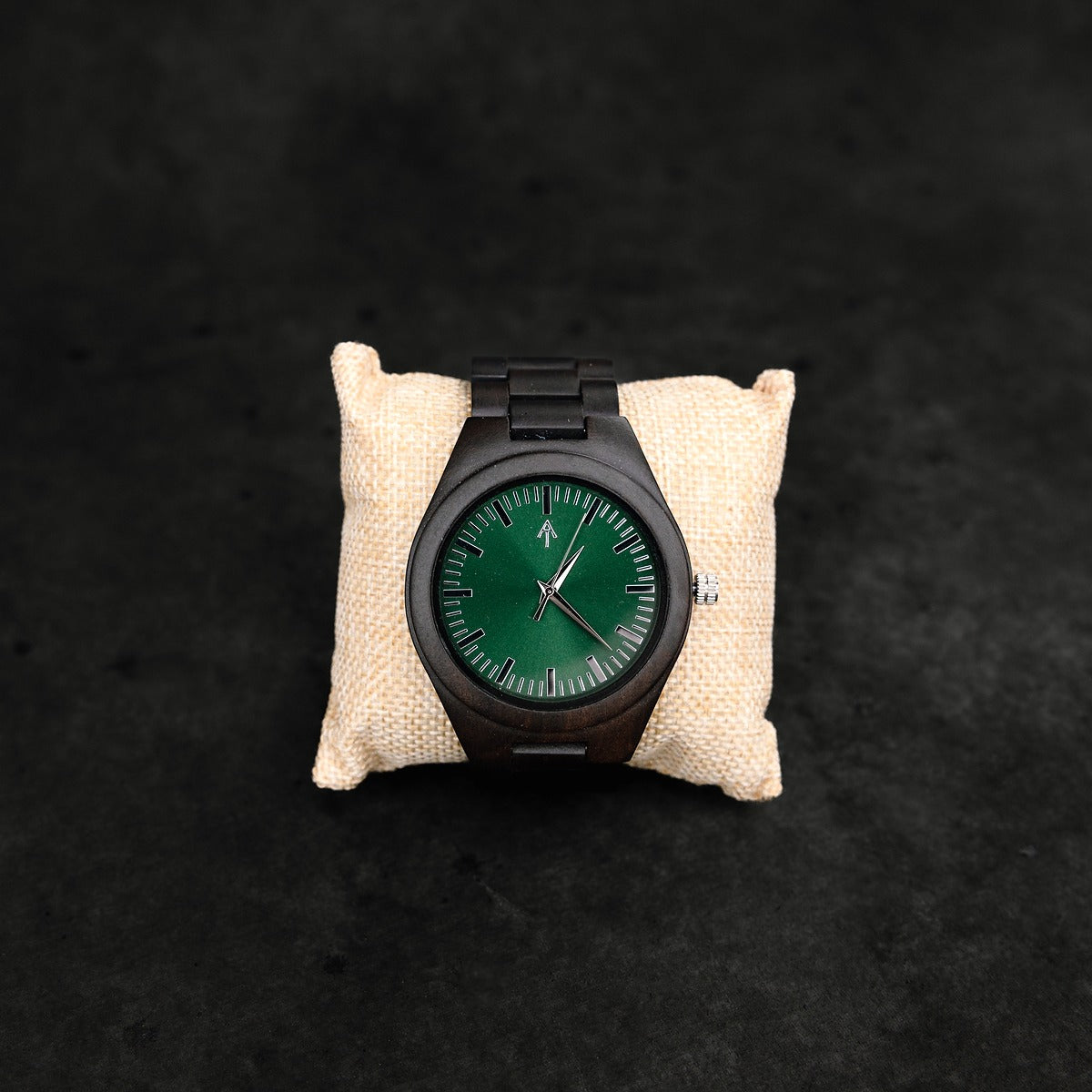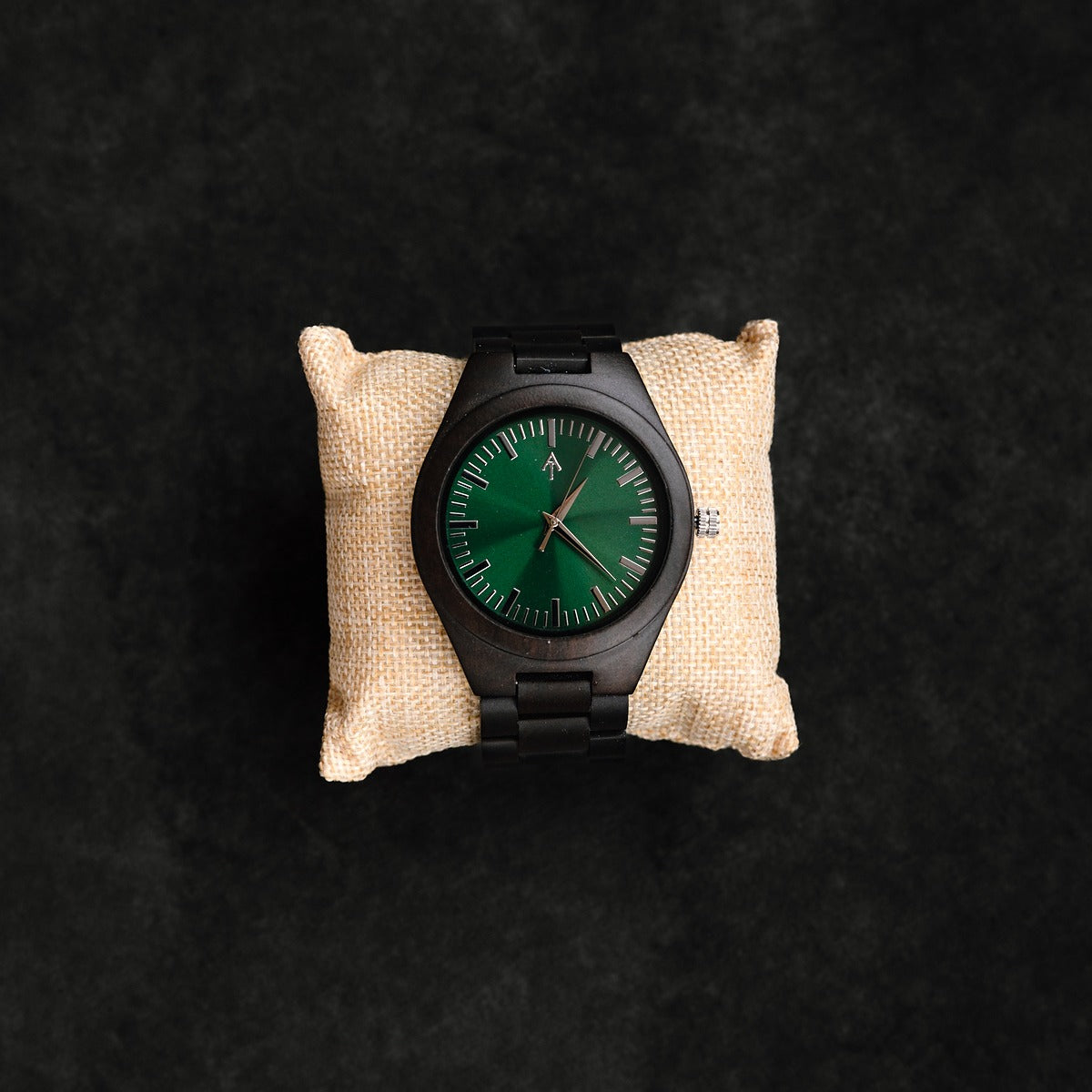 An Ark Timepieces original. Reminiscent of a forest this watch showcases a dark Ebony band and case. This watch is sure to attract attention. It is unique and stylish in a way not easily achieved. Accented with an green metal face