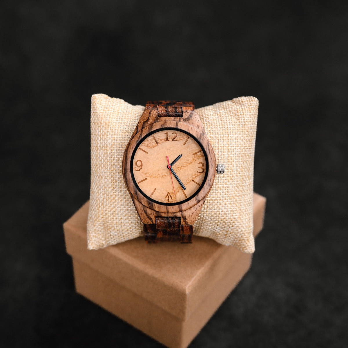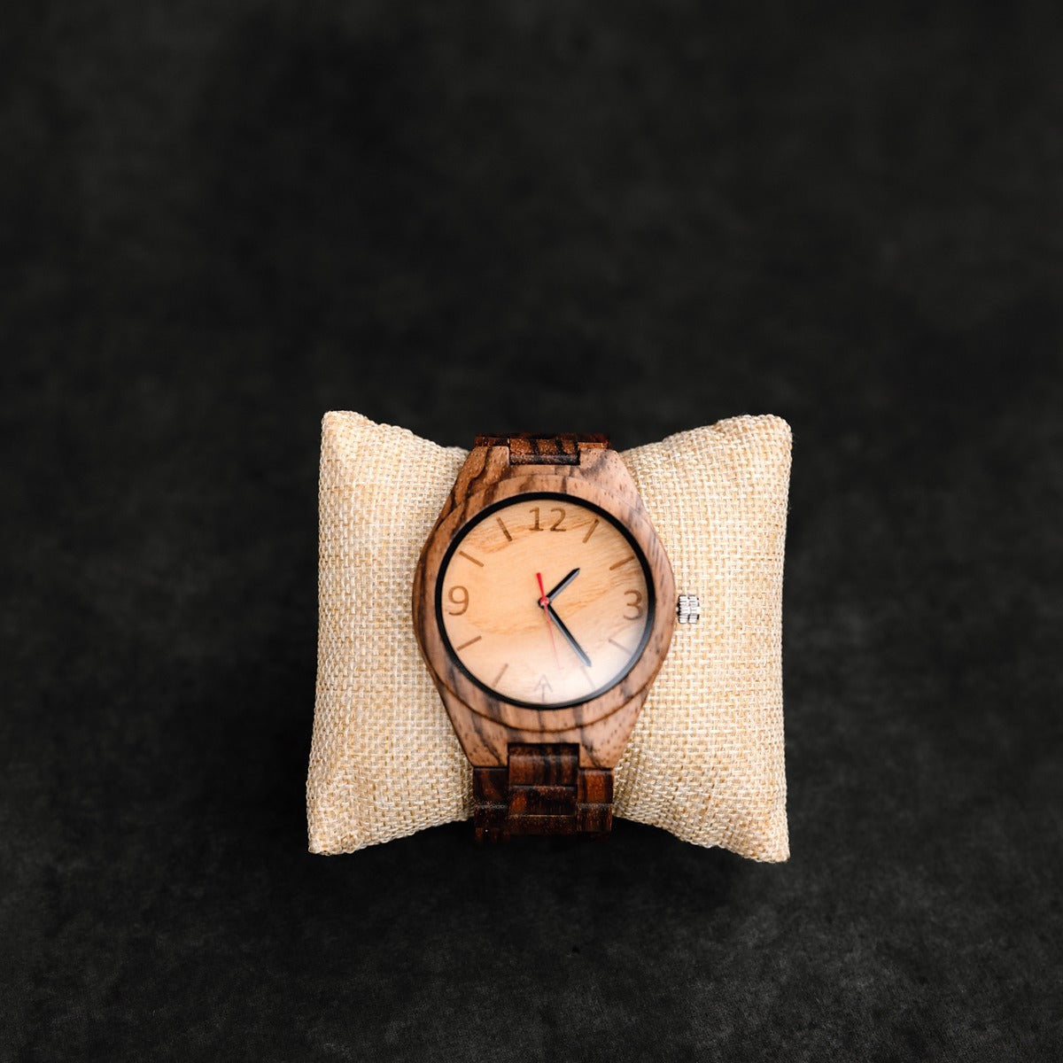 An Ark Timepieces original. Showcasing a zebrawood band and case this band is sure to attract attention. It is unique and stylish in a way not easily achieved. Accented with an Olive Ash wood face