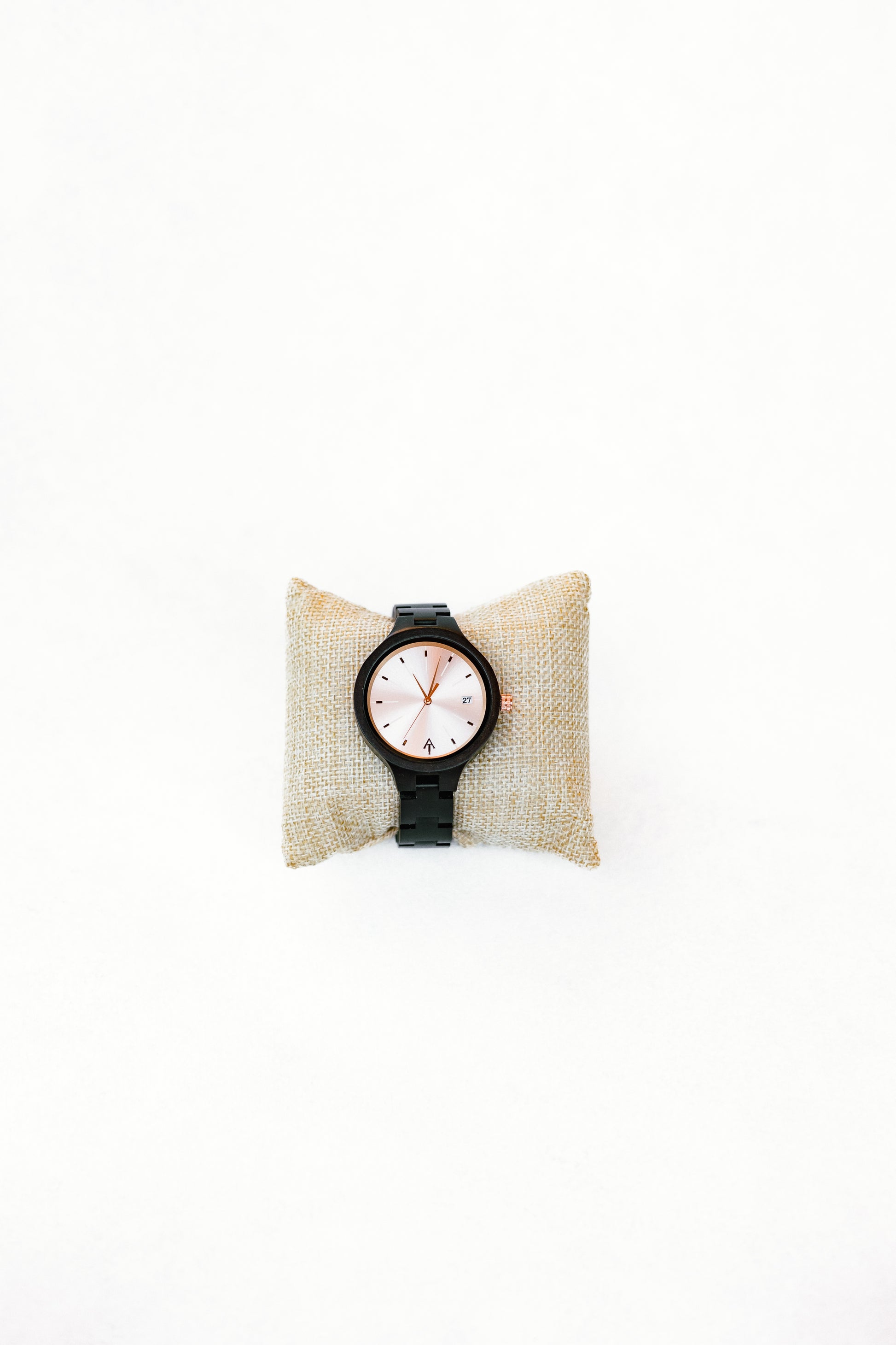 An Ark Timepieces original. With a rose metal face and an ebony wooden band this watch is not only sleek but versatile making it the perfect addition to any outfit.