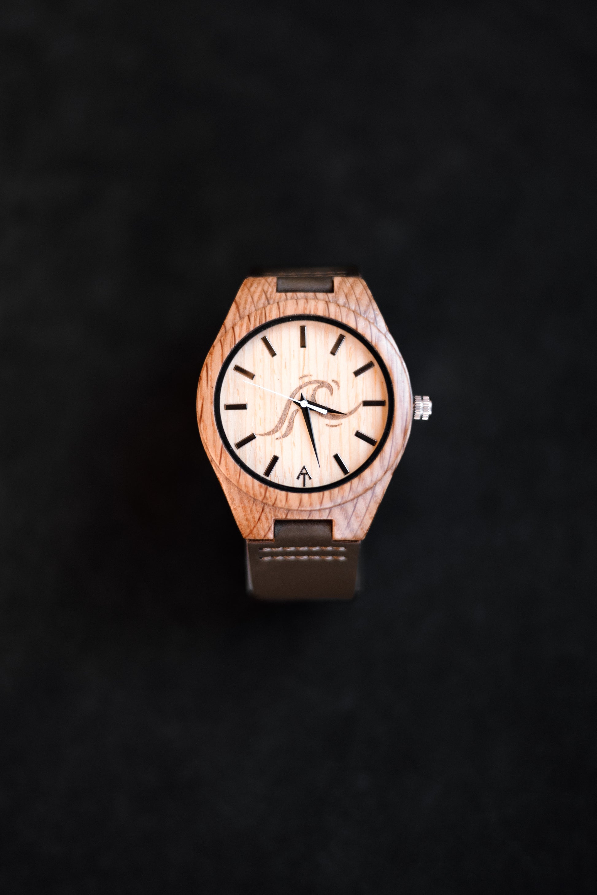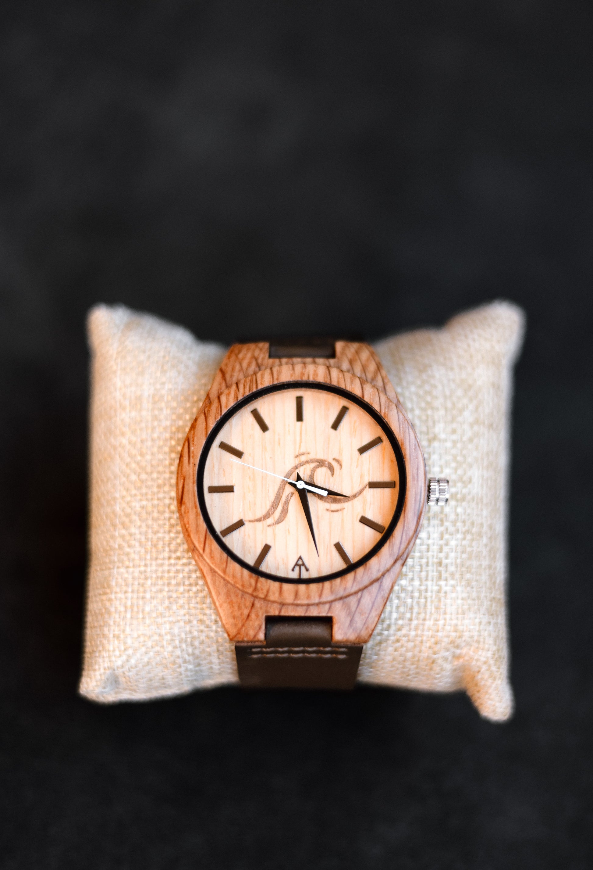 An Ark Timepieces original. With a call to the ocean this is a watch will allow you to carry a wave wherever you go. It has a teak wood case with a maple wood face. It is enhanced with an adjustable brown leather band.